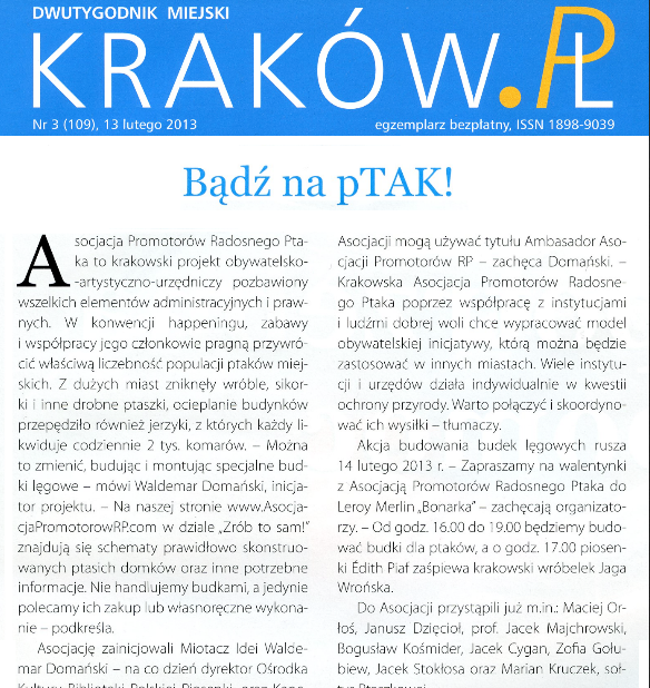 W odpowiedzi na apel Miotacza Idei APRP Muzeum Narodowe w Krakowie przyłącza się do tej niezwykle pożytecznej akcji społecznej wnosząc w wianie 25 budek lęgowych dla wróbla i sikorki. Po ich zamontowaniu dodatkowo zamieścimy w pobliżu informacje ornitologiczne opisujące nowych sąsiadów. Naszym zdaniem będzie to istotny element edukacyjny i atrakcja dla zwiedzających, widzów lub spacerowiczów. Z pełnym przekonaniem zachęcamy inne instytucje i ośrodki kultury w całej Polsce do wstępowania w szeregi Asocjacji. Ten oryginalny krakowski projekt obywatelsko – artystyczno – urzędniczy, który zawiązał się w październiku 2012 roku, wzbudził od razu żywe zainteresowanie mediów w całej Polsce. W krótkim czasie zwerbował i zachęcił do współpracy między innymi Bibliotekę Jagiellońską, Stowarzyszenie Ptaki Polskie, Kancelarię Prezydenta Krakowa, MPK, Andrzeja Sikorowskiego, Krakowskie Biuro Festiwalowe, Jacka Cygana, Klasztor Ojców Franciszkanów, Macieja Orłosia, Janusza Dzięcioła oraz… sołtysa z Ptaszkowej.