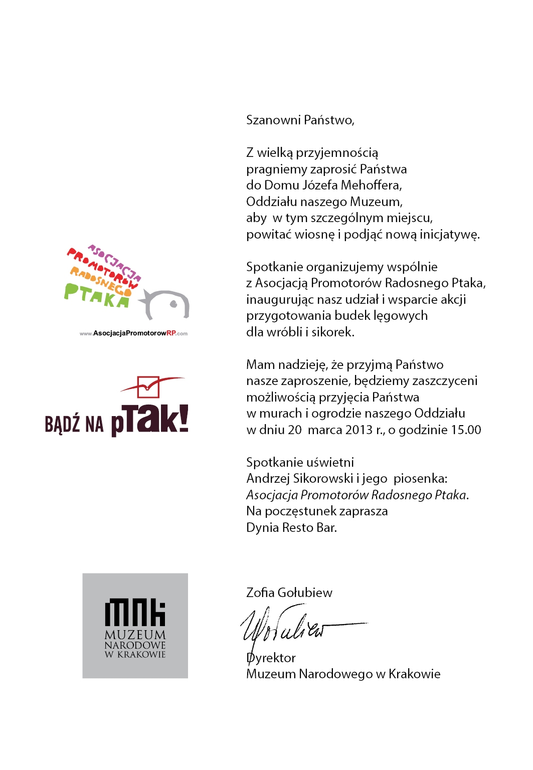 Asocjacja Promotorów Radosnego Ptaka rozpoczęła kolejną akcję, dzięki której w Krakowie przybędzie budek lęgowych. 20 marca o godzinie 15:00 w Domu Józefa Mehoffera, dyrektor Muzeum Narodowego w Krakowie Zofia Gołubiew wraz z Miotaczem Idei Asocjacji Promotorów Radosnego Ptaka – Waldemarem Domańskim, dokonali uroczystego otwarcia sezonu lęgowego, rozwieszając w swoich ogrodach 25 ptasich budek. Data nie jest przypadkowa – 20 marca to Światowy Dzień Wróbla. O oprawę artystyczna zadbał Ambasador Asocjacji RP – Andrzej Sikorowski, który wykonał piosenkę napisaną specjalnie dla Asocjacji.